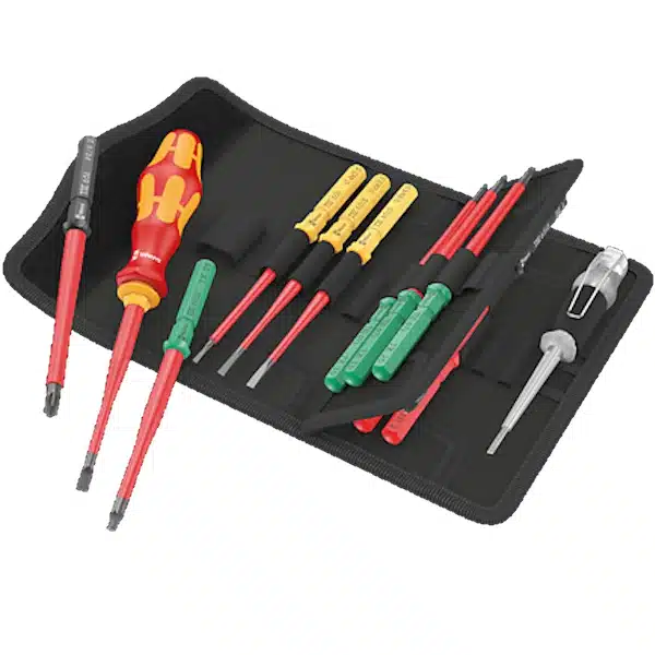 A Wera Kraftform Kompakt VDE 16 Extra Slim 1 egy 16 darabos szigetelt csavarhúzó készlet, amely ideális villanyszerelési feladatokhoz. A készlet tartalmazza a legfontosabb VDE csavarhúzókat és cserepengeket, amelyek a legnagyobb biztonságot nyújtják feszültség alatt végzett munkák során. A Take it easy Tool Finder rendszer biztosítja a gyors szerszámkeresést, a színkódolásnak és lézeres méretjelölésnek köszönhetően.
